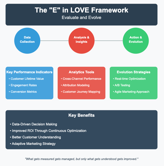 🎯 Remember: what gets measured gets managed, but only what gets understood gets improved. The ‘E’ in LOVE isn’t just about tracking numbers—it’s about translating those numbers into actionable insights that drive marketing evolution.