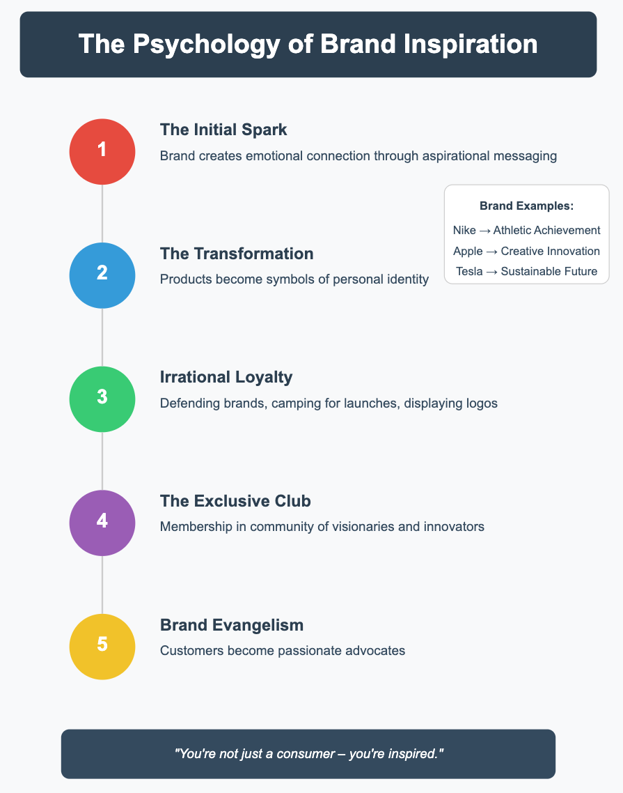 Inspiration acts as the matchmaker in this peculiar romance between consumers and brands. Companies that master this art don’t merely sell products; they sell enhanced versions of ourselves. Apple didn’t just create phones; they transformed us all into creative revolutionaries who coincidentally needed a $1,000 device to unleash our inner genius.
